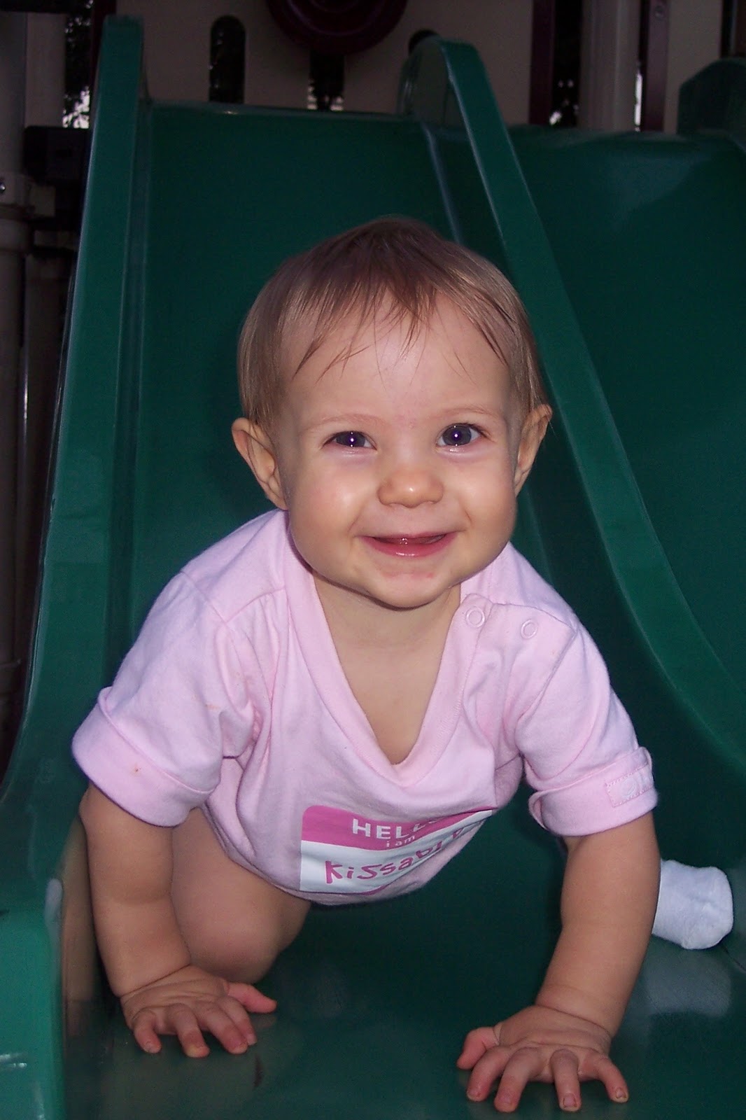 One benefit of having all girls is the opportunity to get lots of use out of the baby clothes we bought or received. When I see the layouts in magazines of celebrities wearing the same dress, it makes me think of how the girls looked in the same outfit. Recently, we got to the end of the kid line with one of my favorite outfits - "Hello, My name is Kissable." I'm still chuckling at the fact that Ella is wearing something at five months that Emma and Charlotte wore when they were one.