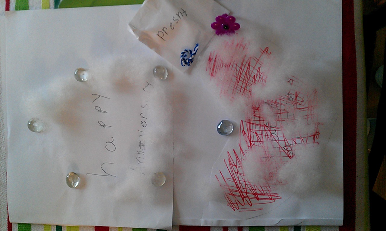 When I got home from work, Emma and Charlotte were eager to make a presentation for our anniversary. They had Brian and I sit on the couch and close our eyes, while they brought us a limited edition card and gift. The gift was two rings - one handcrafted especially for Brian by Emma and the other a cupcake topper for me.